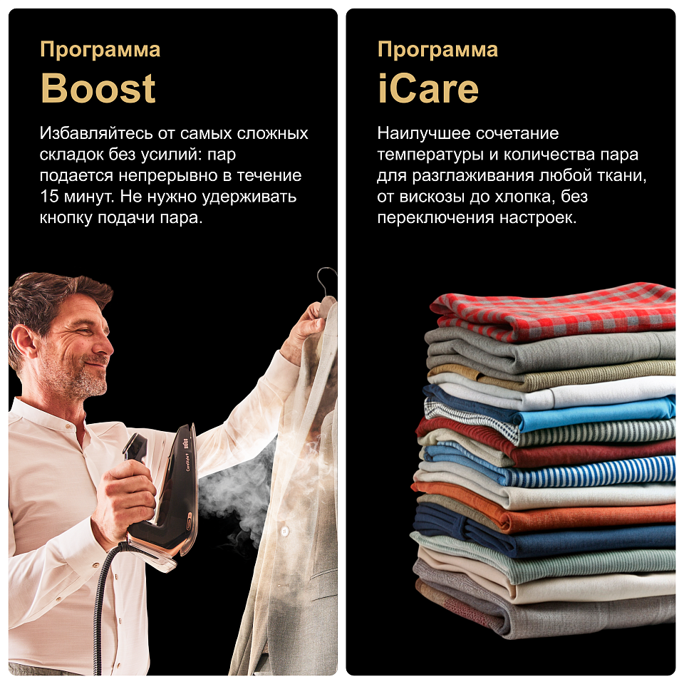 С парогенератором BRAUN IS9090BK каждая вещь обретает безупречный вид. Мощность, интеллектуальные технологии и эргономика создают идеальный результат без лишних усилий.