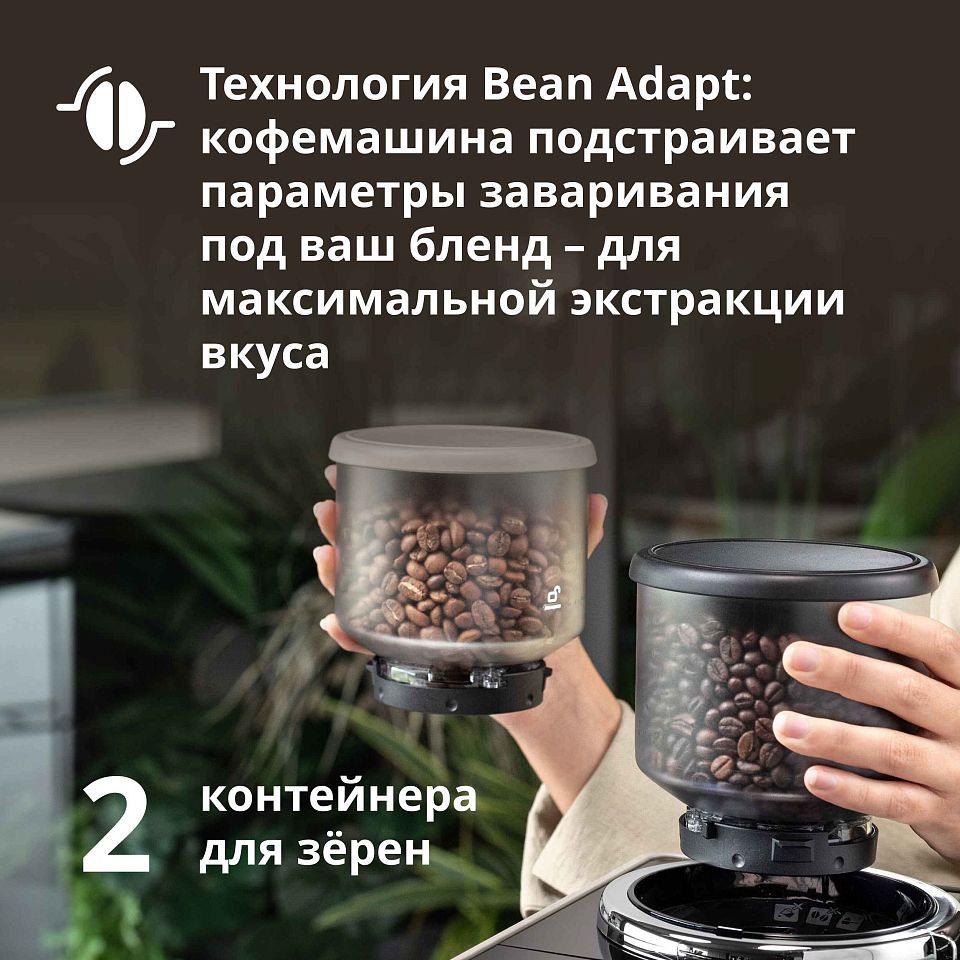Главное преимущество модели — инновационная система Bean Switch с двумя сменными контейнерами по 250 грамм, позволяющая мгновенно переключаться между разными сортами зерен. В сочетании с технологией Bean Adapt, которая в линейке Rivelia впервые встроена непосредственно в интерфейс дисплея, машина автоматически корректирует параметры экстракции для безупречного раскрытия вкусового профиля выбранного кофе. Встроенная кофемолка (13 степеней помола) и помпа с давлением 19 бар гарантируют профессиональную точность и насыщенность каждой порции кофе.
